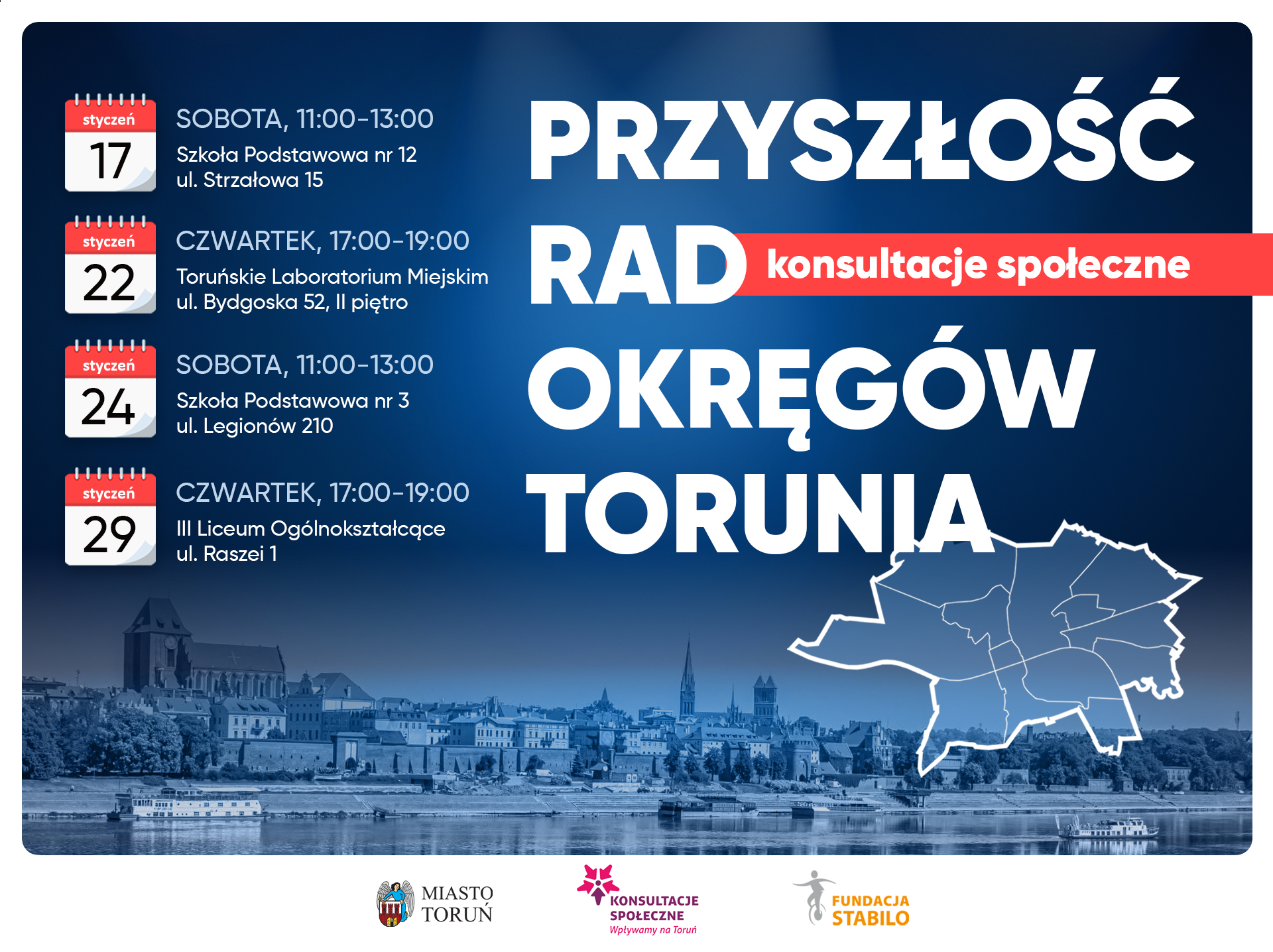 Biuro Dialogu i Innowacji Miejskich we współpracy z Fundacją Stabilo przystępuje do kontynuacji procesu konsultacji społecznych dotyczących zmiany uchwały Rady Miasta Torunia w sprawie powołania okręgów będących jednostkami pomocniczymi Gminy Miasta Toruń oraz nadania im statutów. Temat konsultacji został ujęty w Planie konsultacji społecznych na rok 2025, stanowiącym załącznik do [...]