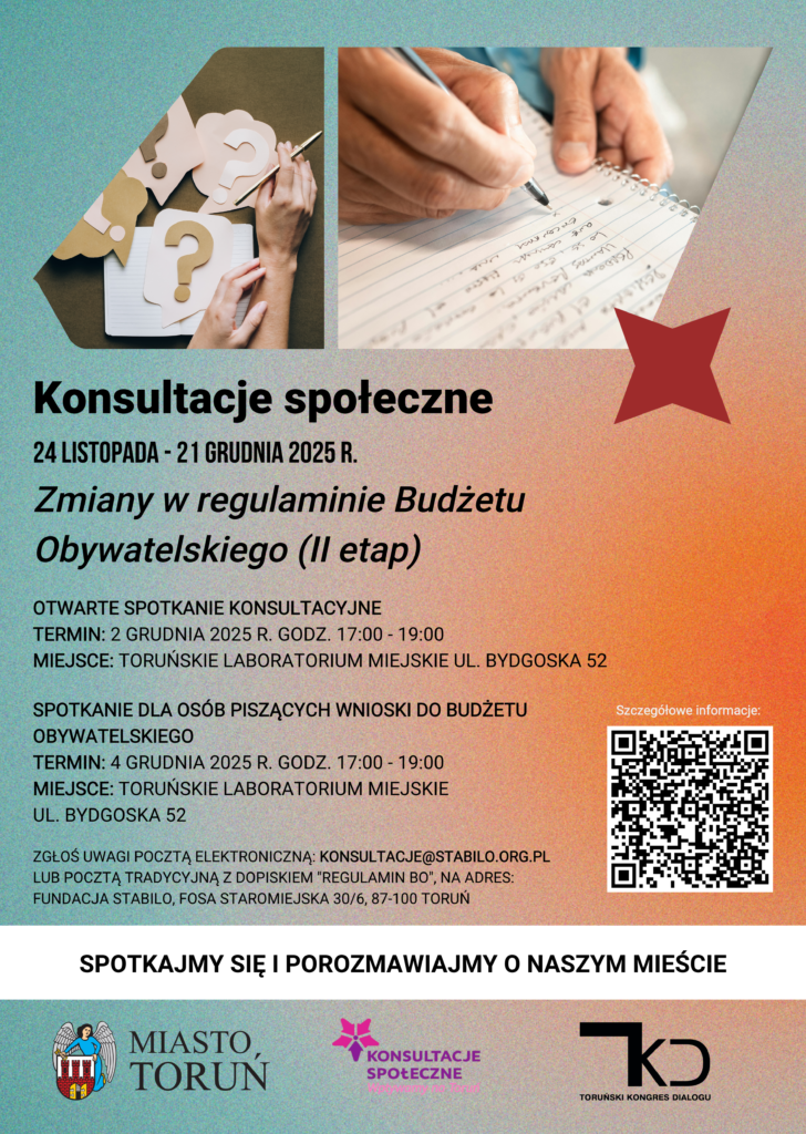 Więcej: https://www.konsultacje.torun.pl/pl/konsultacje-spoleczne-zmiany-w-regulaminie-budzetu-obywatelskiego-ii-etap