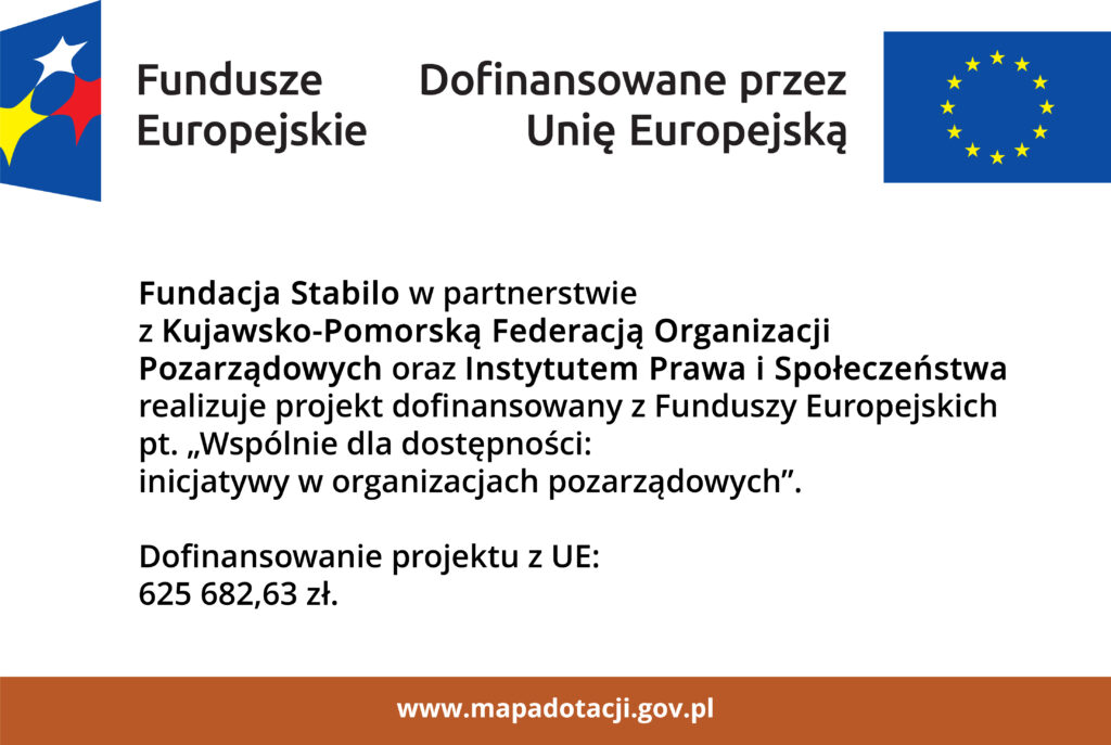 Fundacja Stabilo, Kujawsko-Pomorska Federacja Organizacji Pozarządowych oraz Instytut Prawa i Społeczeństwa zapraszają do udziału w bezpłatnym projekcie „Wspólnie dla dostępności: inicjatywy w organizacjach pozarządowych”.